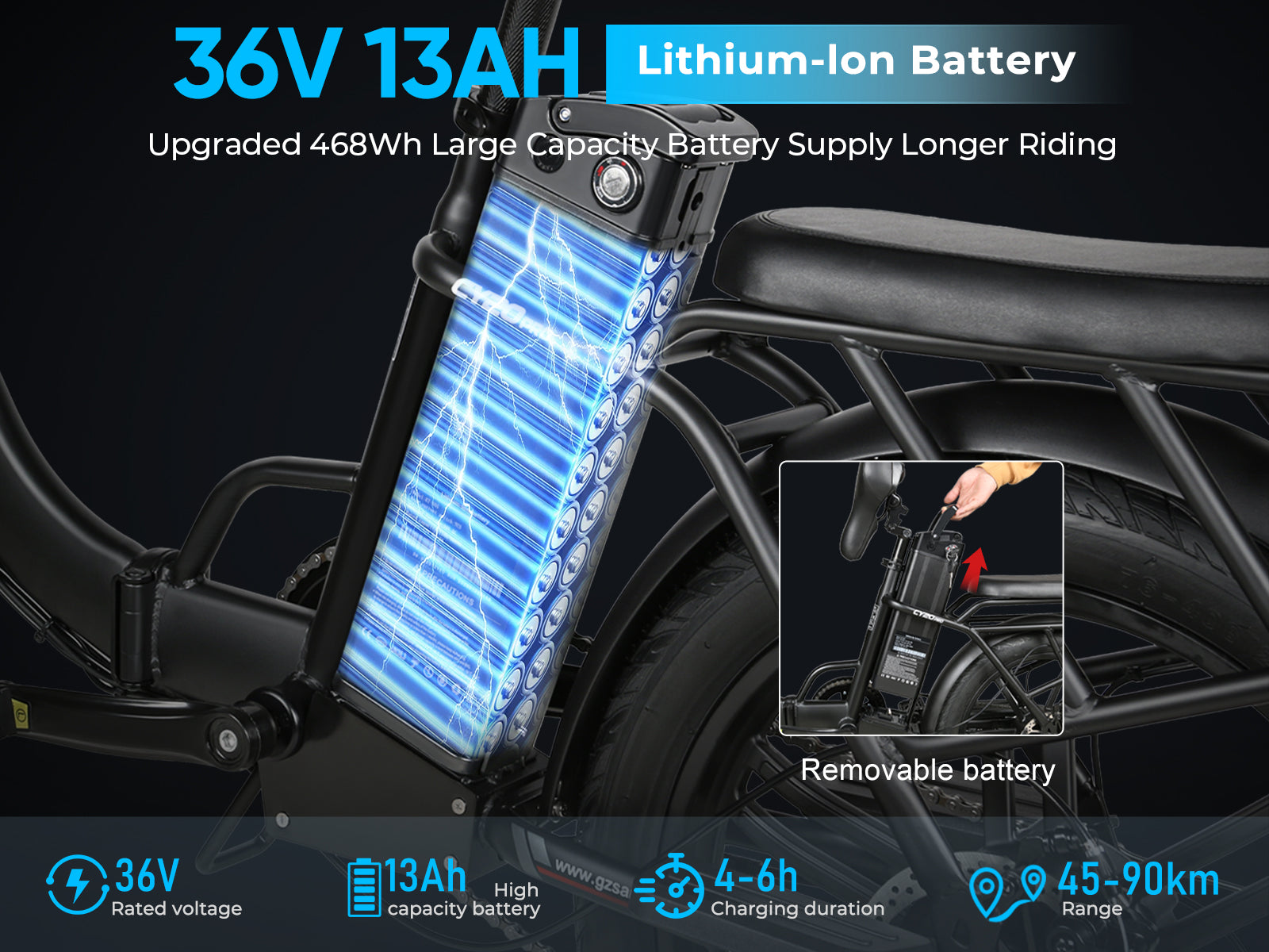 CY20 Pro features a 540Wh seat-integrated portable battery, offering over 55km range in mild electric mode, which can be effortlessly removed for home charging.