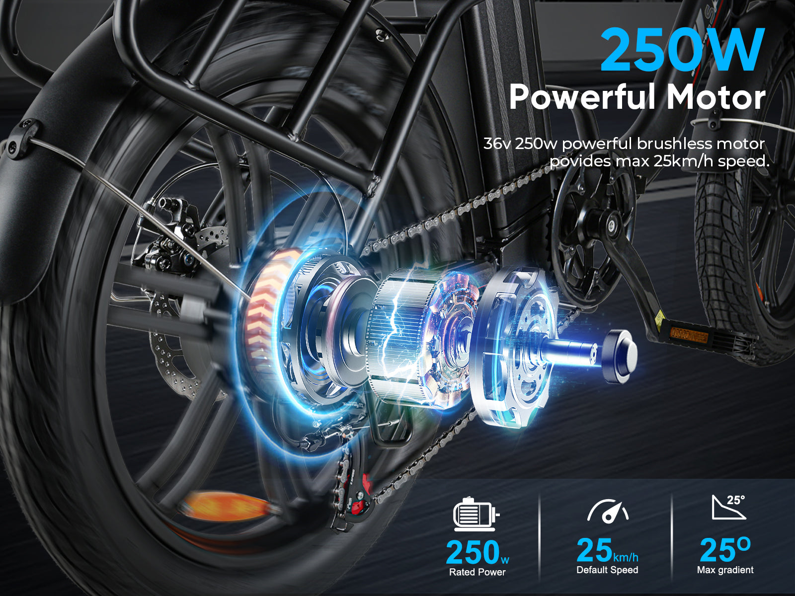 Hidden inside the 20-inch rear wheel is a 250W brushless gear motor, allowing riders to climb up to 25℃ hills while saving energy easily.